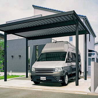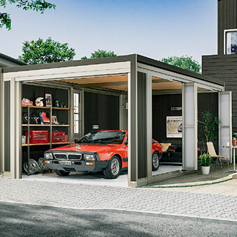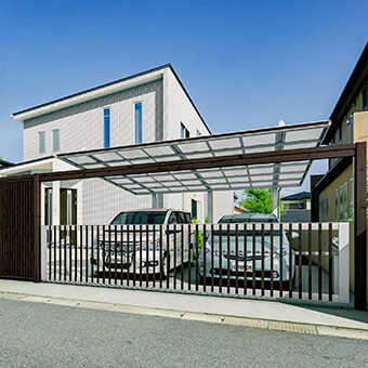カーポートの前面に開閉式の扉を備えたタイプで、防犯性やプライバシー性をさらに高められるのが特徴です。外からの視線や侵入を防ぎつつ、シャッター車庫よりも開放感があり、コスト面でも比較的導入しやすい点が魅力です。住宅の外観に合わせたデザインも豊富で、安心感と見た目の両方を重視する方に選ばれています。